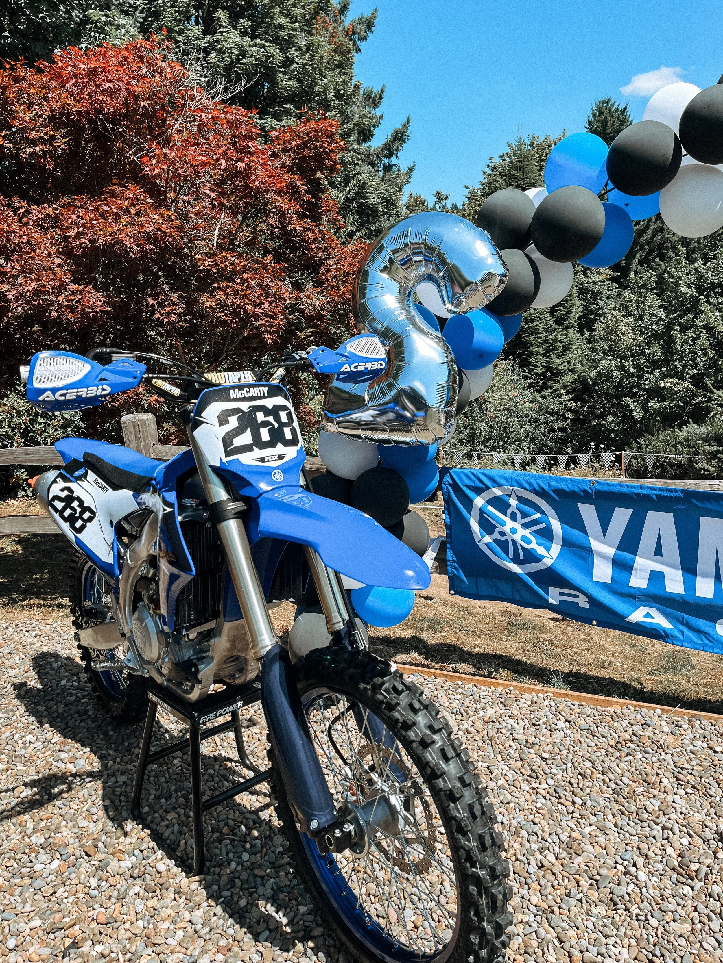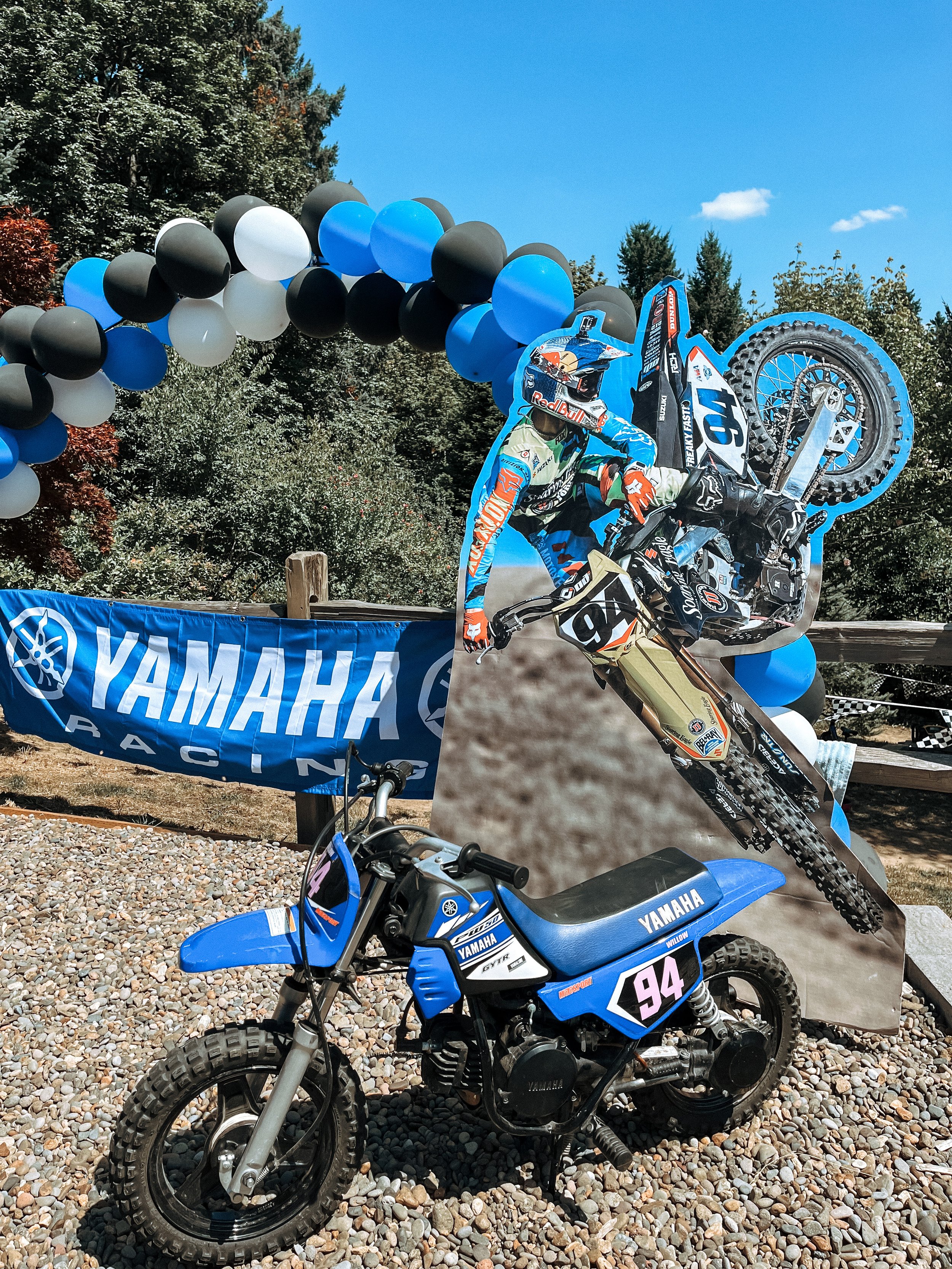 Our Photo area was where the hubbys love of dirtbikes came in handy! We have a few bikes around the house, which worked beautifully. I ordered a balloon arch frame, and picked up balloons from hobbylobby. It worked well, but as anyone who has put balloons outside knows... we lost one after another to the summer sun! lol Worth it... but something to know! Some other details - the Star Racing Yamaha banner, a Lucas Oil banner, and a number 2 balloon. The Ken Roczen cutout is one of those right place at the right time items... Its been in our garage for 10 years, and came from a Safeway (grocery store) Redbull display. We decided to dust him off, and it looked so cool in the photo background.
