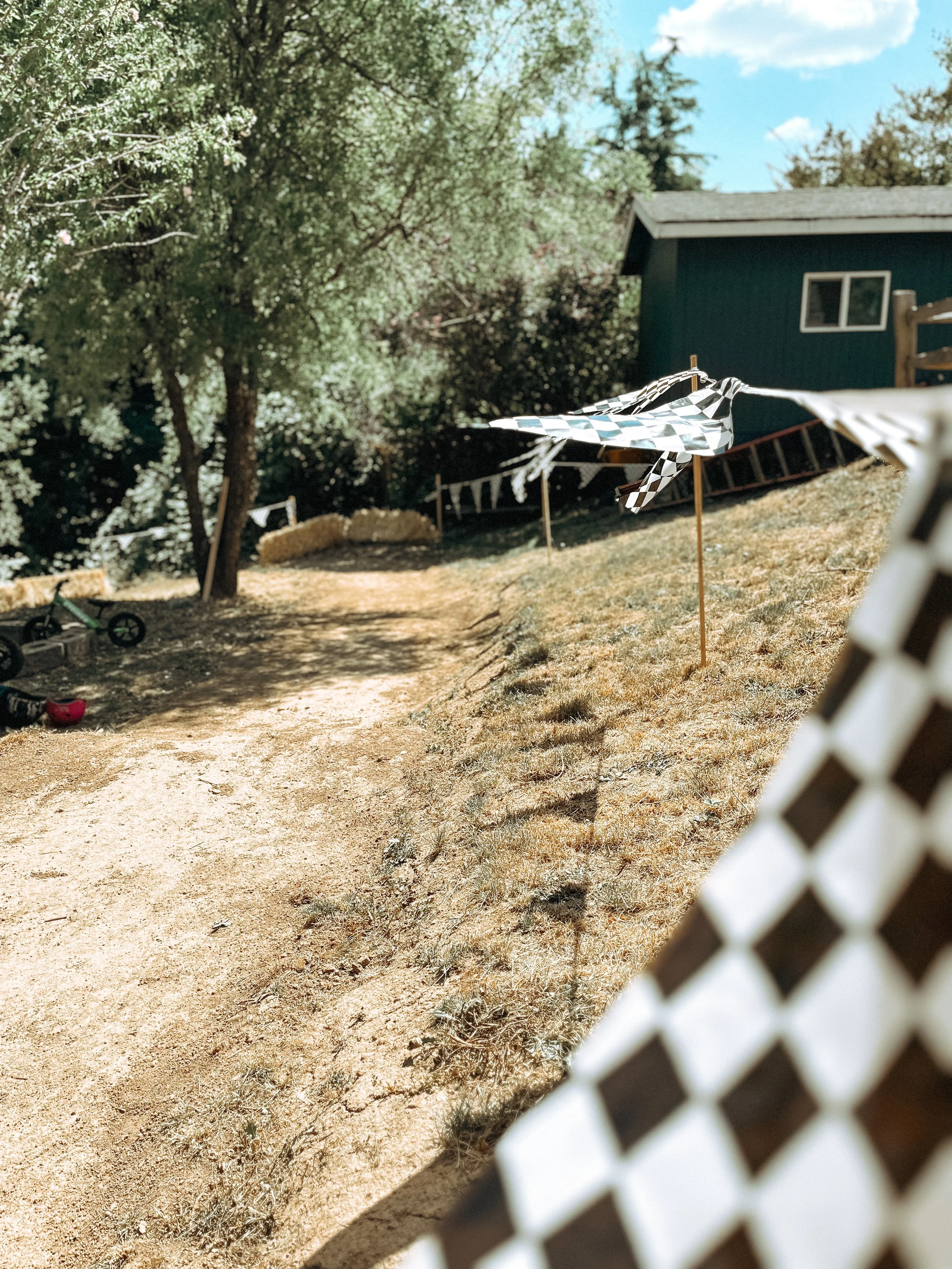 I mentioned the small dirtbike track in our backyard... and I think that was one of the best parts! REALLL on theme. lol Most of our besties are in the dirtbike world too... If you are, you may have heard of a Stacyc. If youre not, there an electric motorcycle... and they're AMAZING. You can catch a glimpse of them above. Our gang of kiddos, and friends have them, so they were able to rip around the track for most of the party! We did Jazz things up a bit with the flags along the perimeter. But sometimes, a simple thing like some dirt is the life of the party! Im cool with that!